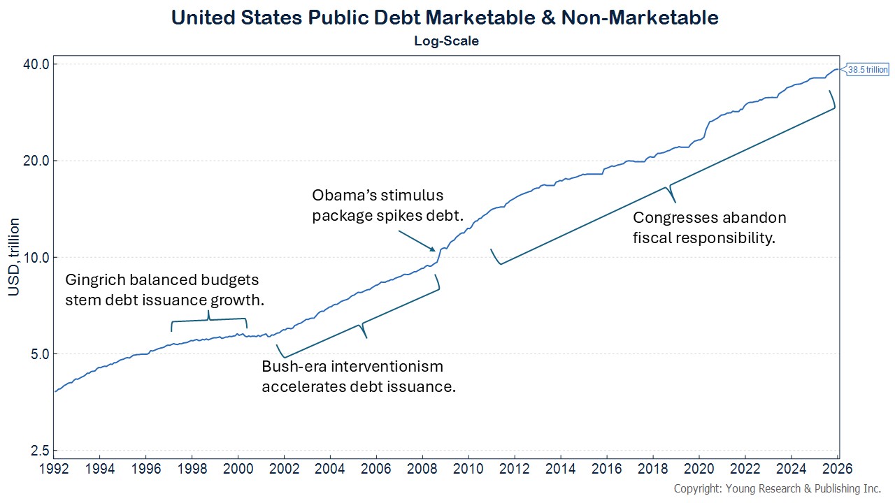 A number of factors contributed to the long decline of the dollar from 2002, including somewhat the uptake in the use of the euro, but mostly loose monetary policy and aggressive nation-building policies by the Bush administration and the so-called “stimulus” by the Obama administration, both of which demanded massive federal spending and debt issuance to fund. After the financial crisis hooked the government on debt, subsequent Congresses seemed to abandon fiscal responsibility altogether.